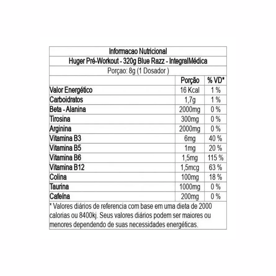 Desenvolvido para atletas e praticantes de atividades físicas que buscam máxima performance, o Pré-Treino Huger da Integralmedica proporciona energia explosiva, foco mental e resistência para treinos de alta intensidade. Sua fórmula é composta por ingredientes cuidadosamente selecionados, como beta-alanina, taurina e cafeína, que atuam em sinergia para potencializar a força muscular, retardar a fadiga e melhorar a concentração. Disponível em diversos sabores, o Huger oferece uma experiência sensorial diferenciada com rápida diluição e absorção.